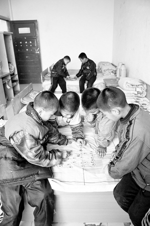 在河南省上蔡县温馨家园里,孩子们在寝室里下象棋。