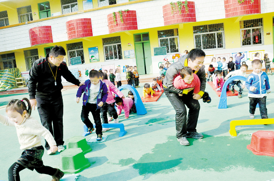 昨日,市实验幼儿园的男教师正在专心和幼儿做游戏。该园新招教了两位男教师,为实验幼儿园注入一股新鲜血液。(记者 王映 摄)