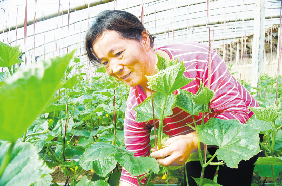 近年来,扶沟县坚持以工业化理念发展农业,以打造“中原经济区的蔬菜生产基地”为目标,以优质无公害蔬菜生产为中心,着力构建规模化、标准化、品牌化的蔬菜格局。图为该县一村民在大棚里管理黄瓜秧苗。(纪俊辉 摄)