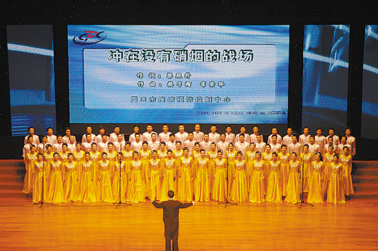 11月20日下午,在省人民会堂内,我省开展了卫生系统院(所、中心)歌咏大赛。来自全省卫生系统的37家单位近5000名“白衣天使”聚集一堂,共同“唱院歌、颂院训,展风采、竞风流”。经过评委认真评审,周口市疾病预防控制中心荣获一等奖。图为大赛现场。邓莉 摄