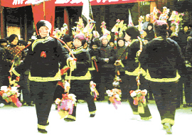担经挑又叫宛丘巫舞或担花篮,主要活动在太昊陵庙会期间。它源于远古时期的“龙花会”,集祭祖、娱神、求子为一体,是淮阳独有的“祭祀太昊伏羲氏的巫舞”。每班四个老斋公(老太太)。三人表演,一人打经板(竹制),在经板声中以说明形式为表演者伴奏。