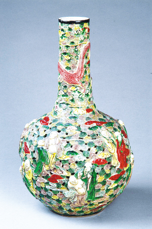 清代云龙十八罗汉透雕五彩瓶