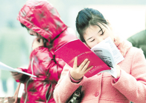 11月27日,在洛阳理工学院考场外,两名准备参加考试的考生在抓紧时间复习。当日,2012年度中央机关及其直属机构考试录用公务员公共科目笔试在全国开考。(新华社发)