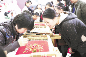 11月27日,在武汉举行的全民创业赶集会现场,参观者观摩汉秀项目展示。据悉,在当天的展会上,共有600多个项目亮相。(新华社发)