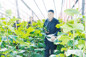 昨日,商水县东城办事处苏坡行政村一菜农在大棚内摘收黄瓜。据该村党支部书记苏双印介绍,村里这两年经常组织菜农到山东寿光等地参观学习蔬菜生产和管理方法,发展蔬菜大棚就地转移劳动力400多人,棚菜收入达到360多万元,人均增加2000多元。(记者 王映 摄)