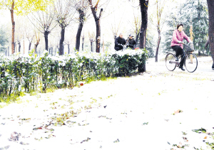 11月29日晚, 我市迎来今冬首场降雪。图为滨河路两边的草丛被薄薄的积雪覆盖。(记者 王映摄)