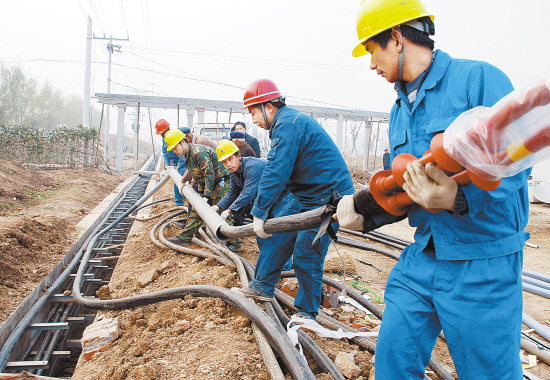 沈丘县电业局积极备战冬季用电负荷高峰,11月26日至28日,连续奋战三天,完成对35千伏“肖东线”和“肖西线”的改造,提高了县城35千伏东关变电站和西关变电站的供电可靠性,提升了县城供电质量。图为11月27日工作人员架设高压电缆的场景。(赵腾明 摄)