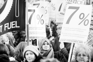 呼吁“碳公正” 12月3日,环保主义者在英国首都伦敦举行示威,响应正在南非德班召开的世界气候大会,抗议世界上最富裕的7%人口占用全球50%的碳排放量。 新华社发