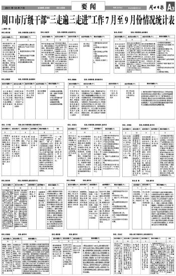 走访乡镇数(13个) 商水县汤庄乡、商水县城关乡、沈丘县槐店回族镇、沈丘县东城办事处、沈丘县北城办事处、沈丘县付井镇、川汇区文昌办事处、川汇区人和办事处、川汇区七一路办事处、西华县红花镇、西华县娲城办事处、西华县箕子台办事处、西华县昆山办事处