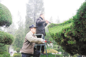 昨日,淮阳太昊陵独秀园园艺师在修剪松柏树枝。连日来,一年一度的独秀园松柏造型修剪工作正在进行,很快将有更多形态各异的造型植物,呈现给广大游客。 ( 记者 李寒 摄)