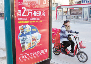 一位郑州市民骑车从一块新楼盘促销广告牌旁经过。