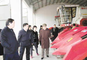 12月6日,以柬埔寨王国参议院秘书长翁萨勒(左二)为首的代表团一行5人,参观考察了黄泛区农场地神种业公司、天鹰缸套公司、鑫欣牧业公司、绿原化工公司和农业分场农机库,并表达了愿意与黄泛区农场共同开发柬埔寨农业的愿望。图为翁萨勒一行在黄泛区农业分场农机库进行参观。(钱国顺 摄)