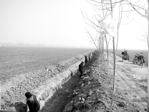 本报讯 12月16日,天气虽然寒冷,但项城市李寨镇油许村东沟渠清淤现场却彩旗飘扬,人头攒动,机声轰鸣,百余名群众正在抓紧修整沟渠,20辆三轮车来回穿梭,呈现出一派热火朝天的景象(如上图)。这是该镇抓住冬季农闲时节大兴农田水利建设的一个缩影。