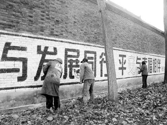 商水县张庄乡高度重视计生文化宣传工作,利用墙体标语简洁易懂、醒目、持久等特点,在全乡27个行政村每村刷写5—25幅墙体计生宣传标语,使生育文明无处不在地影响着群众生活,成为计生文化传播过程中一道亮丽风景线。 图为该乡葛岗村正在刷写计生标语。 (张丽娟 摄)
