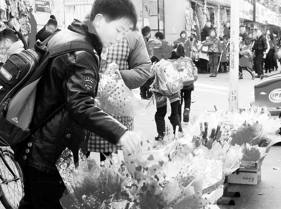 昨日,一位小学生在购买“平安果”。随着圣诞节的临近,很多店铺将平安果摆上柜台。据悉,每逢平安夜前夕,苹果便华丽转身,扮成平安果,因为“苹”与平安夜的“平”字谐音,加之特殊的节日气氛,便被赋予特殊含义,成为了年轻人所青睐的礼物。 ( 记者 王映 摄)