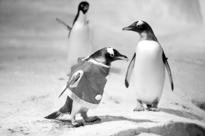 12月24日在天津极地海洋馆拍摄的一只穿上圣诞服饰的企鹅。