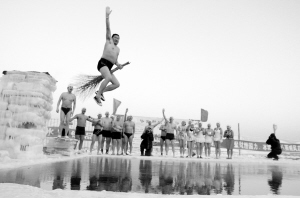 12月25日,在黑龙江省哈尔滨市的松花江哈南新城冬泳浴场,一名冬泳爱好者在表演“跳冰水”。