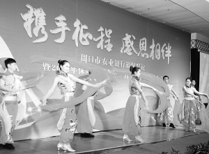 新的一年到来之际,中国农业银行周口分行和全市18家保险公司的干部职工欢聚一堂,畅叙友情。图为农行周口分行在表演舞蹈《开门红》。(记者 李寒 摄)