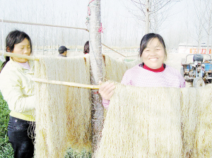 日前,商水县城关乡郭庄村几位村民在晾晒粉条。农闲时节,该县积极引导农民利用自家小庭院发展小作坊、小禽场、小果园等致富项目,走出了一条农民增产增收的新路子。(刘飞 摄)