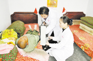 在“双节”来临之际,周口妇产医院的医务人员携带大米、面粉、油及专门为孩子购买的帽子、围巾等物品,来到川汇区福利院,慰问了那里的孤寡老人和残疾、智障儿童,随车的内、外科专家还为他们进行了体检。(记者 沈湛 摄)
