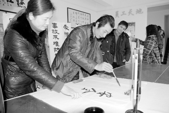 为庆祝元旦节的到来,沈丘县电业局举办了以安全生产为主题的“安生杯”书画比赛活动。图为该局书法爱好者在书画比赛展览现场交流书法技艺。(赵腾明 摄)