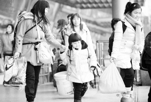 1月3日,在南京火车站候车室外,小朋友跟随家长准备乘车返乡。随着春节临近,跟随父母在异乡生活的孩子们像候鸟一般,开始陆续返回故乡。虽然路途辛苦,但有了父母的陪伴,归乡路上也就多了一分幸福。 |