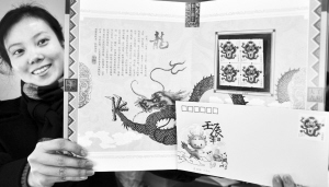 | 《壬辰年》生肖“龙”邮票1月5日发行 1月4日,苏州邮政局工作人员展示即将发行的《壬辰年》邮票和首日封。中国邮政集团公司将于1月5日发行《壬辰年》邮票。这张生肖“龙”邮票是第三轮生肖“龙”邮票,在设计上基本参考了明清蟠龙的造型,与我国第一枚生肖“龙”邮票——“大龙”邮票的形式有某种程度上的呼应。