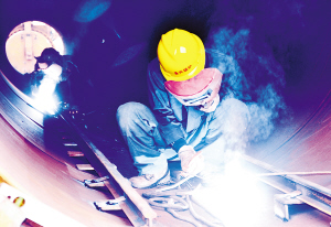 图为两名工人焊接锅炉。近几年来,依靠一支技术过硬的制造队伍,太康锅炉品牌唱响大江南北。