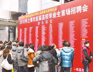 2012年上海市应届高校毕业生首场招聘会开幕 1月10日,前来求职的高校毕业生在会场外记录参会单位信息。当日,由上海市人社局、上海市教委等单位举办的“2012年上海市应届高校毕业生首场招聘会”在上海国际展览中心拉开序幕。参加此次招聘会的单位共有484家,提供各类岗位8230个。