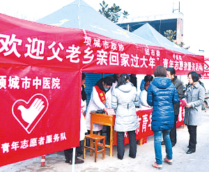 1月9日上午,为让返乡的父老乡亲感受到家乡的温暖,过上一个欢乐、祥和的新春佳节,项城市中医院组织部分医护人员深入到项城市客运中心站、项城市长途汽车站,举行“欢迎父老乡亲回家过年”青年志愿者活动。在活动现场,青年志愿者免费提供茶水、晕车药,并开展免费义诊和健康咨询活动。据了解,该项活动将持续开展一周。