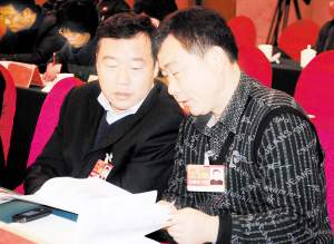 昨日,出席省十一届人大五次会议的代表们在驻地审议有关报告。图为代表们在交换意见。