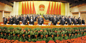 省十一届人大五次会议主席团执行主席卢展工、曹维新、王菊梅、李新民、王文超、刘怀廉、刘新民、张程锋、铁代生、储亚平、蒋笃运、连子恒在主席台前排就座。大会由主席团执行主席、省人大常委会主任卢展工主持。