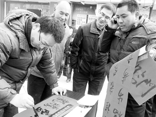 1月13日,扶沟县纪委监察局联合县清风书法院在县城街头举行了“廉政春联”义写活动。县城知名书法家们纷纷挥毫泼墨为群众义写春联,当天现场共送出廉政春联500多幅,受到群众的欢迎。(纪俊辉 摄)