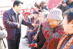 县委书记任连军在城乡居民养老金首发式上与群众代表交谈。