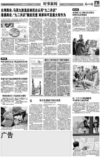 台湾舆论:马英九胜选反映民众认同“九二共识”
