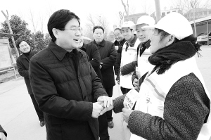 陈志伟紧紧拉住环卫工人的手嘘寒问暖。记者 杜少华 摄