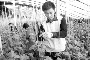 1月26日,淮阳县城关镇马庄村大学毕业生马伟国在温室大棚里管理反季节无公害黄瓜。3年前大学毕业后,他返回家乡建起了近20亩的冬暖式蔬菜大棚,搞起了反季节蔬菜种植。如今在马伟国的带动下,该村已经发展地下温室、地上蔬菜大棚总面积达500亩。