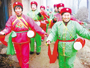 随着龙年元宵节的到来,我市城乡各种喜庆活动增多,文化表演日趋红火。商水县积极组织农村民间艺人表演扭秧歌、跑旱船、抬花轿等,深受广大群众的欢迎。图为该县平店乡李岗村组织的“夕阳红”表演团正在乡村街道表演。
