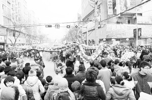 正月十五闹元宵。2月6日,扶沟县城关镇西关居委会表演的舞龙狮、狮子摔跤、二鬼相会等节目,引来众多群众前来观看,为元宵佳节增添了浓厚的节日气氛。(邹鹏举 摄)