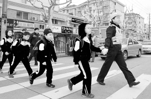“警花”护校 “天使”平安 2月7日,女民警项玲娣在护送小学生快速通过人行横道。当日是上海市中小学开学第一天,为了给孩子们打造一条交通安全线,由闵行交警支队8名女民警组成的“女子护校队”赶赴辖区内中小学执行护校任务。