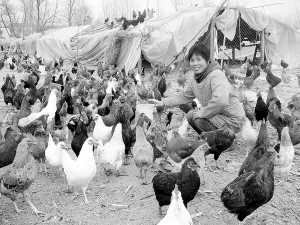 2月3日,商水县平店乡平店村留守妇女王玉琴正在给柴鸡喂食。在乡党委、乡政府的帮扶下她家饲养柴鸡2000余只,年收入可达5万余元。据了解,该县各级党委、政府和有关部门采取成立农民专业合作社+技术协会等形式积极引导农民进行科学规模养殖,有效地降低了农业风险,增加了农民收入。(记者 岳建辉 通讯员 赵永昌 摄)