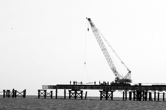 2月8日,大连南部滨海大道跨海大桥建设工程在进行海上栈桥打桩铺设。日前,我国首座海上地锚悬索式跨海大桥——大连南部滨海大道跨海大桥,已进入海面桥墩施工阶段。大桥设计为双层双向八车道,全长5.3公里,预计2013年底竣工通车,将为大连城市南部打通一条重要的交通动脉。 (新华社发)