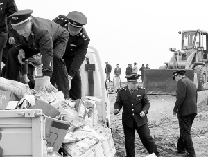 春节过后,扶沟县工商局以酒水、饮料、乳制品、儿童食品、肉制品和食用油等为重点种类,开展了流通领域食品安全专项整治行动,共查获仿冒火腿肠369件,“三无”、过期食品120公斤,全部集中销毁。(卢付昌 摄)