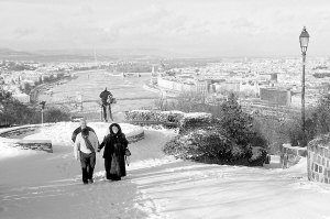 布达佩斯雪后风光 2月15日,游人登上匈牙利首都布达佩斯的多瑙河畔的盖雷特山欣赏雪景。新华社发