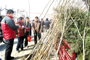 昨日上午,几名群众在集会上购买果树苗。随着气温回升,我市越来越多的群众开始购买树苗,准备植树。(记者 孙安平 摄)