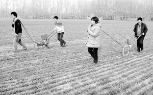 天气转晴,气温回升,我市农民立即投入到春耕生产中,田间施肥、浇地、耕地的农民随处可见,一幅幅春耕图跃然在周口大地。图为扶沟县农民正在给麦田施肥、深翻土地。谷志方 摄