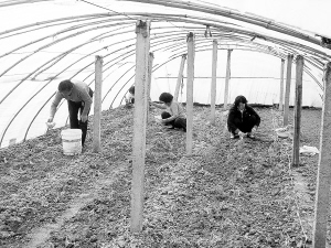 商水县平店乡积极引导广大农民发展无公害蔬菜1000余亩,亩均收入达5000余元,有效地促进了农民增收致富。图为几位农民正在大棚里栽植早春番茄。赵永昌 摄