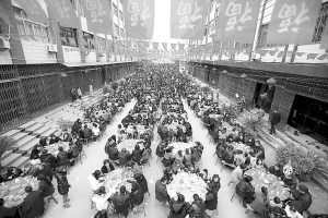 2月19日,村民在彩旗和灯笼高挂的街头一起享用“百家宴”。 当天是农历正月二十八 ,浙江省瑞安市塘下镇鲍田迎来一年一度的“百家宴”,村民摆出1900多桌酒宴,近2万人赴宴。据了解,瑞安鲍田的“百家宴”始于宋朝,已有1000多年的历史。 新华社发