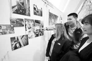 2月18日,在美国旧金山唐人街,几名观众观看“寻根之旅”成果展。由旧金山中华文化中心举办的2011年度华裔青少年“寻根之旅”中国行成果展于当日在旧金山开幕。 新华社发