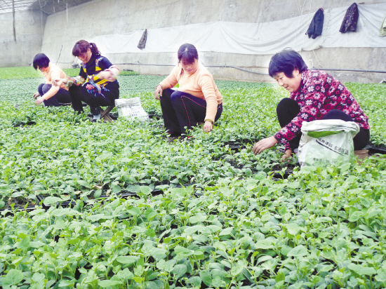 春节过后,扶沟县城郊乡部分农民并没有外出打工,而是在现代化的育苗厂当起了农业工人,定点上下班,每月也有近千元的收入。图为她们在育苗厂内筛选苗子。(谷志方 摄)